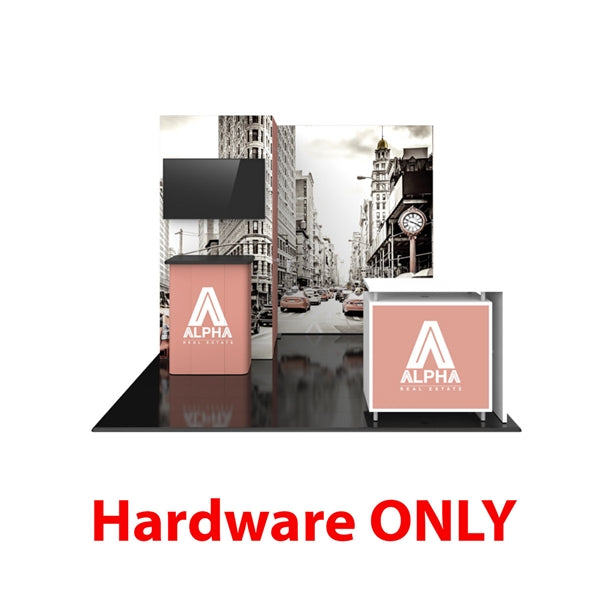 Hybrid Pro Modular exhibits are event ready custom designed trade show booths that combine easy toolless assembly, high quality lightweight hardware and custom printed graphics for sophisticated and stylish branding. Manufactured in North America, the display hardware is constructed of heavy duty aluminum framing and graphics are dye-sub printed on tension fabric or UV printed on laminate panels. Accents, as pictured, may include TV mounts, tables and lighting (see specs/instructions for kit specific details). Hard molded shipping cases are included to protect your exhibit during shipping and storage. Read more...
